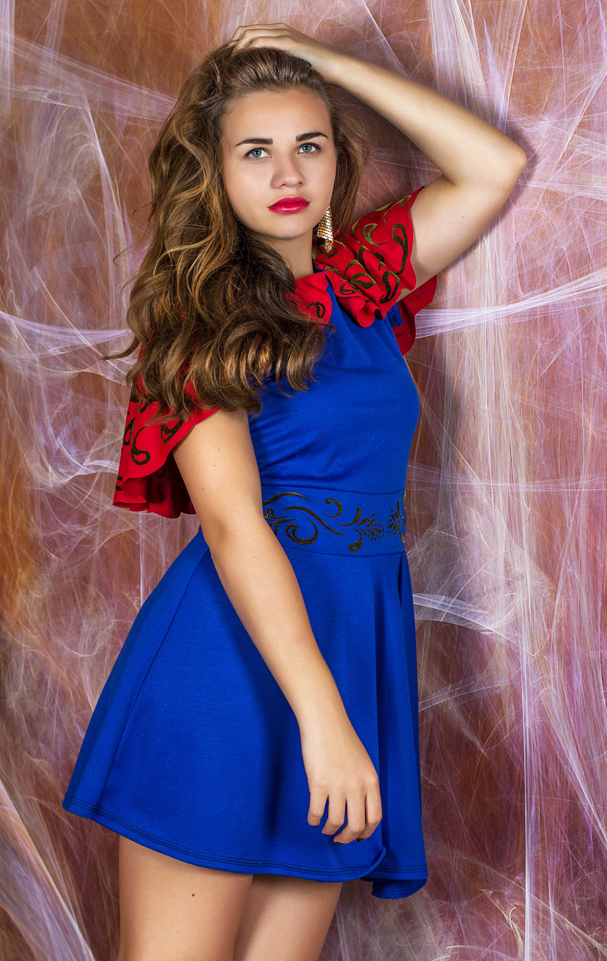 На плечах красивая накидка украшена бархатной накаткой, на поясе бархатная накатка, юбка клеш.